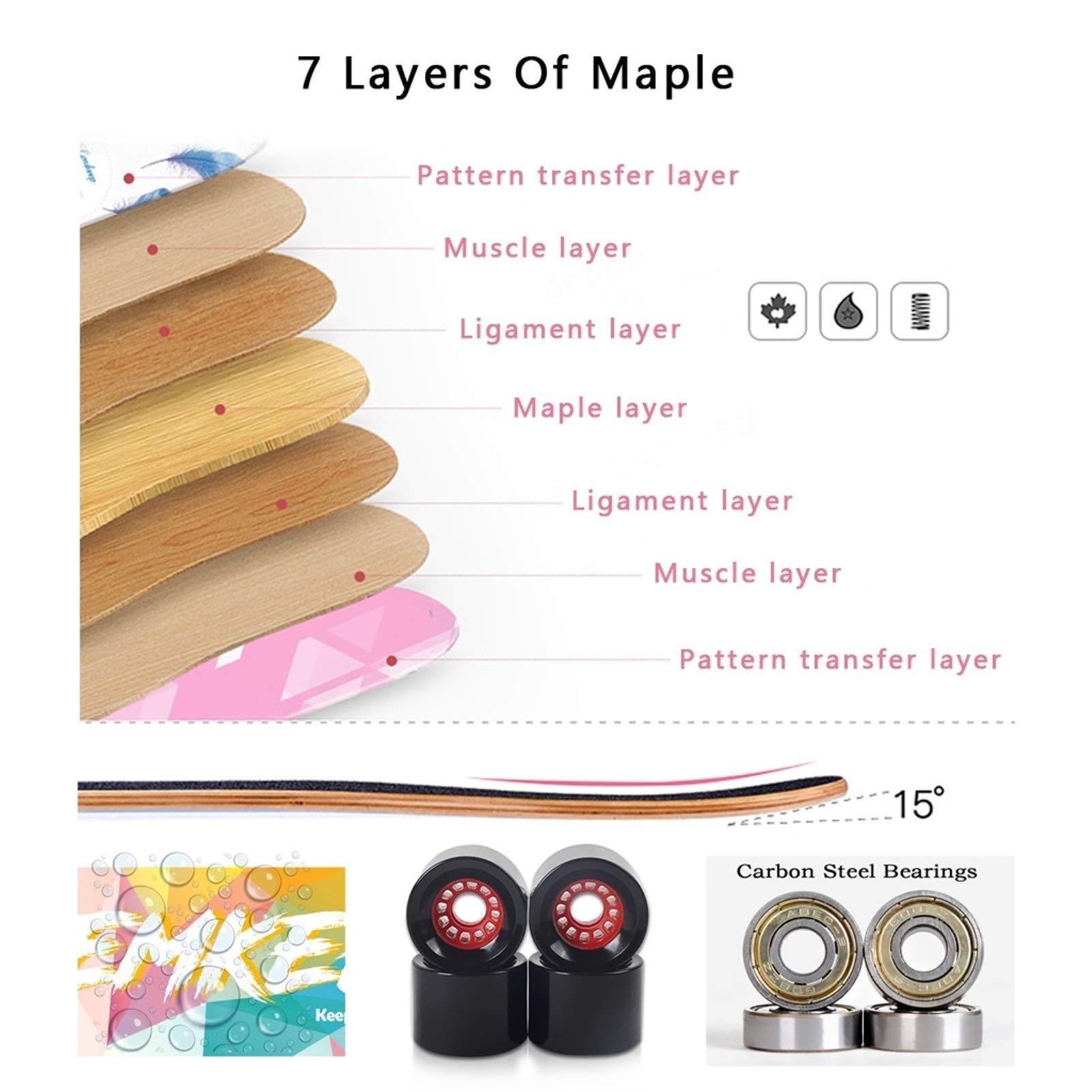 - QUALITY WHEELS AND BEARINGS: super smooth & comfortable control, equips with ABEC precision bearing, PU wheels and super soft PU bushings deliver a very smooth ride, this long boards skateboard is suitable for all smooth surfaces or even rough ground.